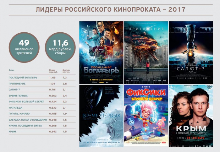 Самым кассовым отечественным фильмом стал «Последний богатырь» (1,65 млрд руб., 7,3 млн зрителей). В десятку также вошли картины «Притяжение», «Салют-7», «Время первых», «Фиксики: большой секрет», «Матильда», «Гоголь. Начало», «Бабушка легкого поведения», «Кухня. Последняя битва» и «Крым».