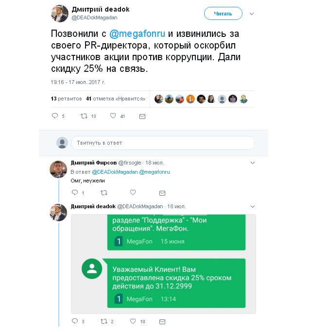 Житель Магадана Дмитрий, сообщил в Twitter, что "МегаФон" предоставил ему скидку 25% на услуги связи до конца 2999 года в качестве извинений за пост PR-директора Петра Лидова о "малолетних дегенератах".