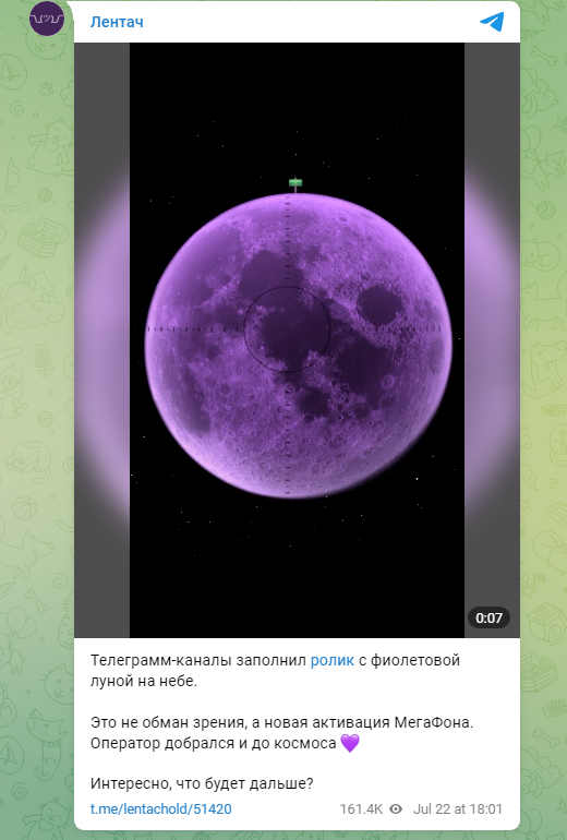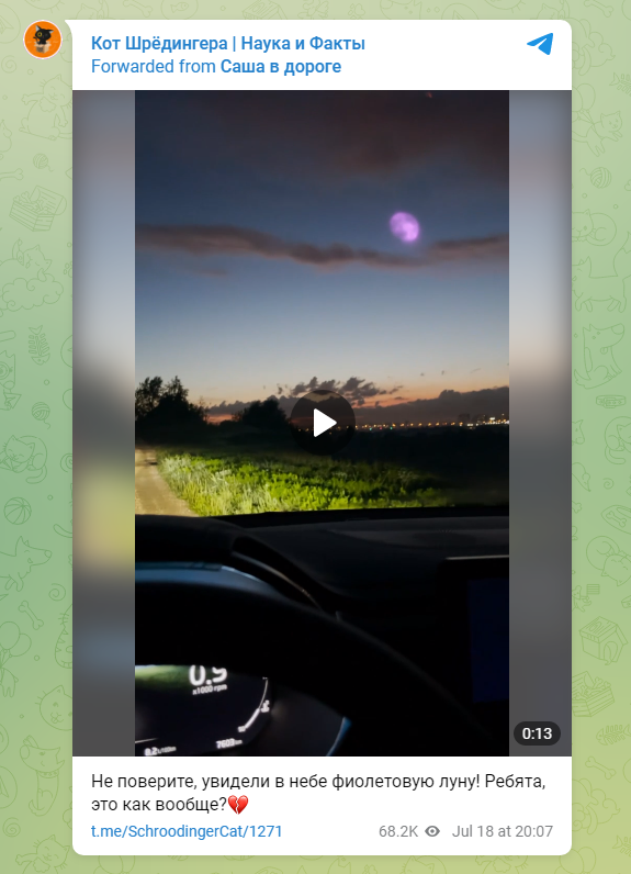 На первом этапе загадочное видео появилось в авторском канале — пользователь едет ночью по сельской местности и видит Луну фиолетового цвета. Специально для этого был создан Telegram-канал вымышленного блогера-путешественника, который и поделился видео.