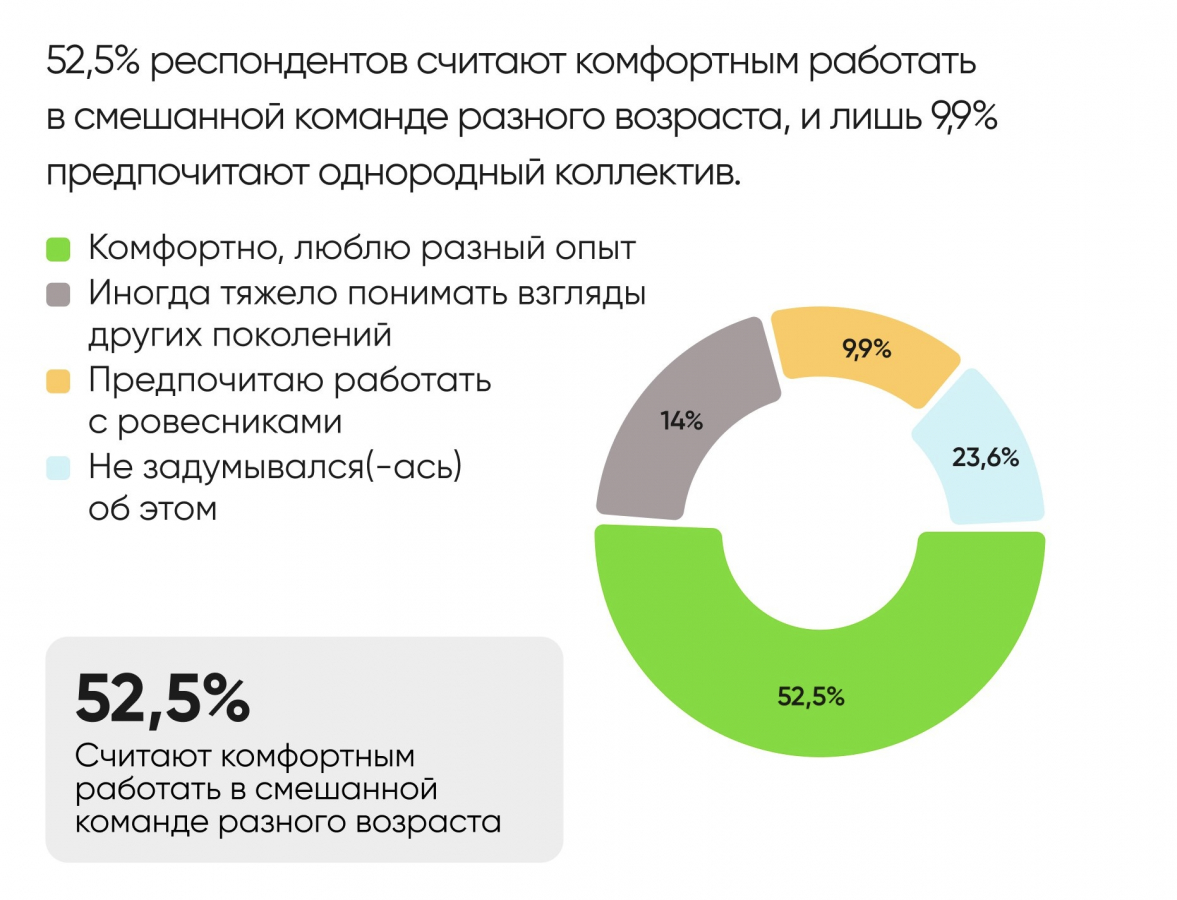 Старшие респонденты чуть чаще испытывают трудности в мультигенерационных командах и чаще хотели бы работать с ровесниками (12% у возраста 61+, против 6−8% у более молодых). Но в целом корреляция с возрастом незначительная — большинство респондентов любых возрастов считают команды из разных возрастов «интересными и комфортными».