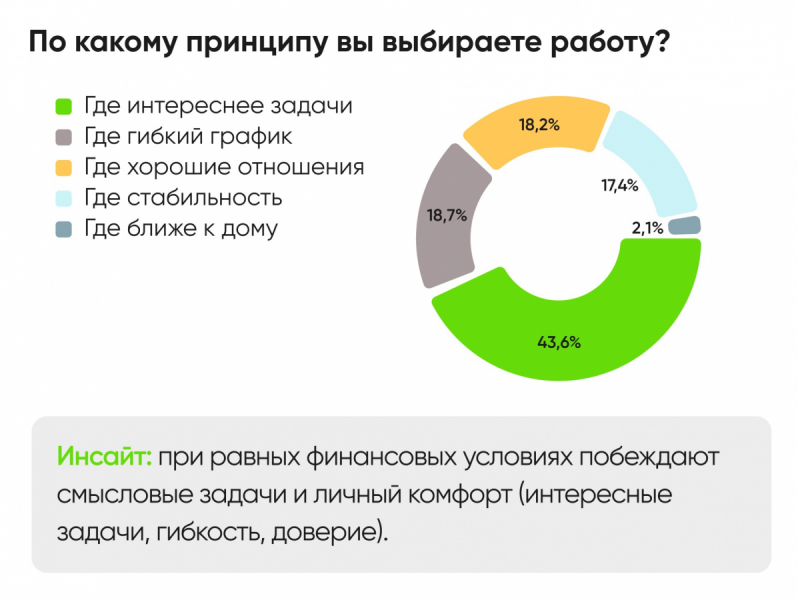 Для компаний подобные показатели — сигнал: внутренняя коммуникация напрямую влияет на вовлеченность и бренд работодателя, особенно в креативных сферах. Линейные сотрудники ценят дружелюбную атмосферу в коллективе (36,5%) и отсутствие конфликтов (20,4%). Руководители же считают главными прозрачность и честность (60%) и четкие роли/границы (63,1%). Важно, что при равных финансовых условиях побеждают интересные задачи и личный комфорт (стабильность, доверие, гибкий график).