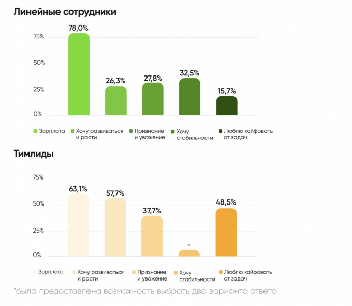 Что включает сотрудников в рабочий процесс? На первом месте — зарплата (ответили 78% линейных сотрудников), за ней — стабильность и признание. Молодежь чаще выбирает «кайф от задач» и развитие, старшие — стабильность и деньги.