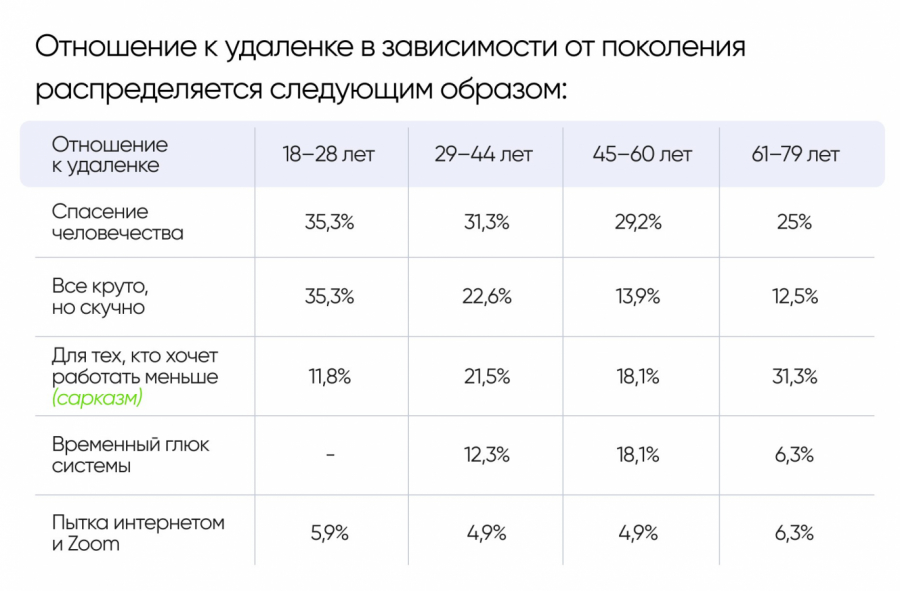 Изначальная гипотеза о том, что молодые (поколение Z) выбирает исключительно удаленку, не подтвердилась: большинство респондентов предпочитает гибридный режим работы. Совмещение офиса и удаленки («и то, и другое, зависит от настроения») выбрали 61−69% во всех группах: 61% среди 29−44 лет, 69,2% среди руководителей; 68,8% — в группах 18−28 и 61−79 лет.