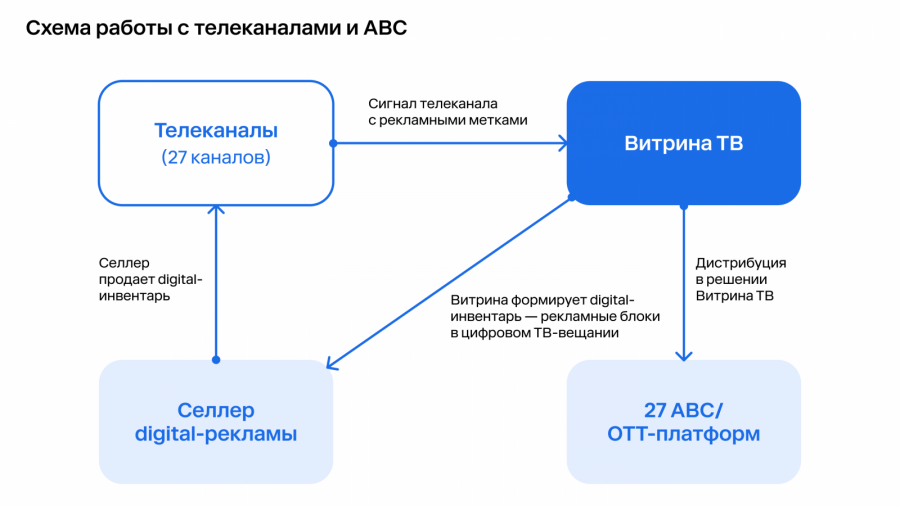 Дополнительным технологическим игроком рынка является компания «Витрина ТВ», которая выбрана Роскомнадзором единственной уполномоченной организацией по трансляции в интернете каналов первого и второго мультиплекса, а также семь каналов крупных медиахолдингов, таких как ТНТ4, СТС LOVE и других. Помимо этого, «Витрина ТВ» управляет распространением каналов и осуществляет мониторинг для всех сайтов и приложений, которые показывают прямой эфир российских телеканалов.