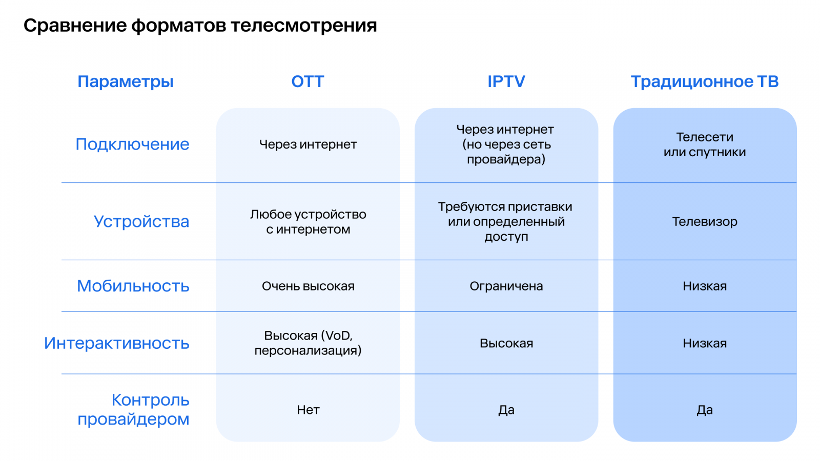 Существуют разные форматы digital TV: IPTV, OTT, CTV и HbbTV. Они отличаются не только технологией доставки контента, но и тем, как потребитель взаимодействует с видео, а значит, и тем, как бренды могут выстраивать коммуникацию.