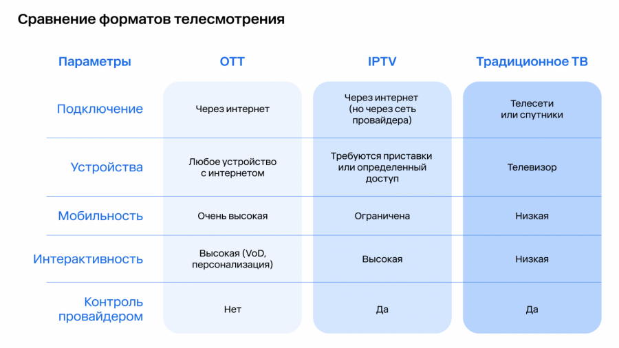 OTT-сервисы создают и распространяют контент через интернет, а CTV превращает этот онлайн-видеопоток в привычное «большое экранное» ТВ-потребление.