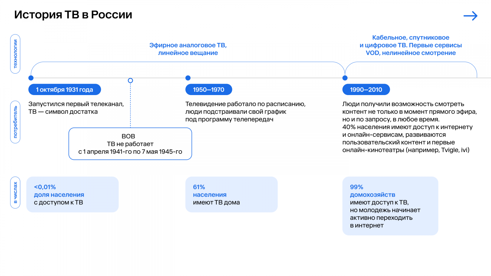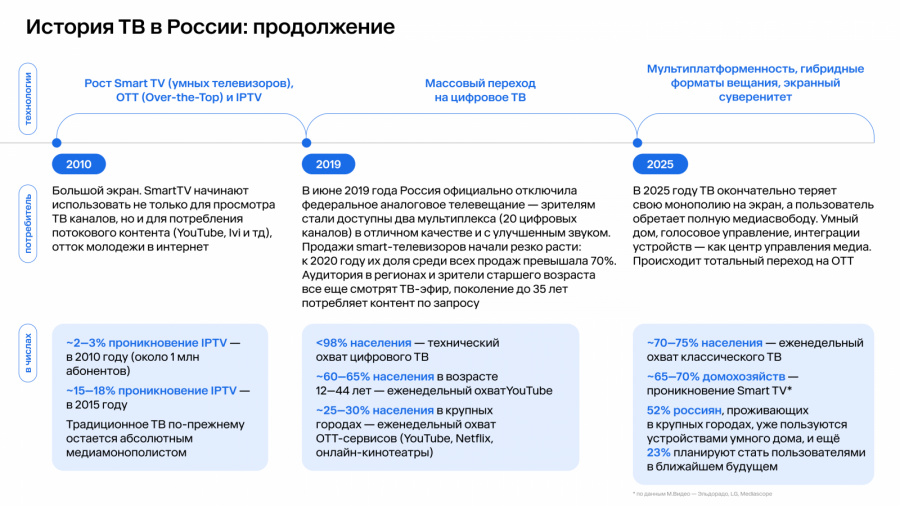 В 2000-х развитие кабельного, спутникового и IPTV-вещания, а затем и онлайн-платформ привело к фрагментации медиапотребления и усложнению инфраструктуры. Сегодня телесмотрение распределено между эфиром, сетями операторов и цифровой средой, что требует от рекламодателей комплексной работы с разными типами инвентаря и логиками планирования.