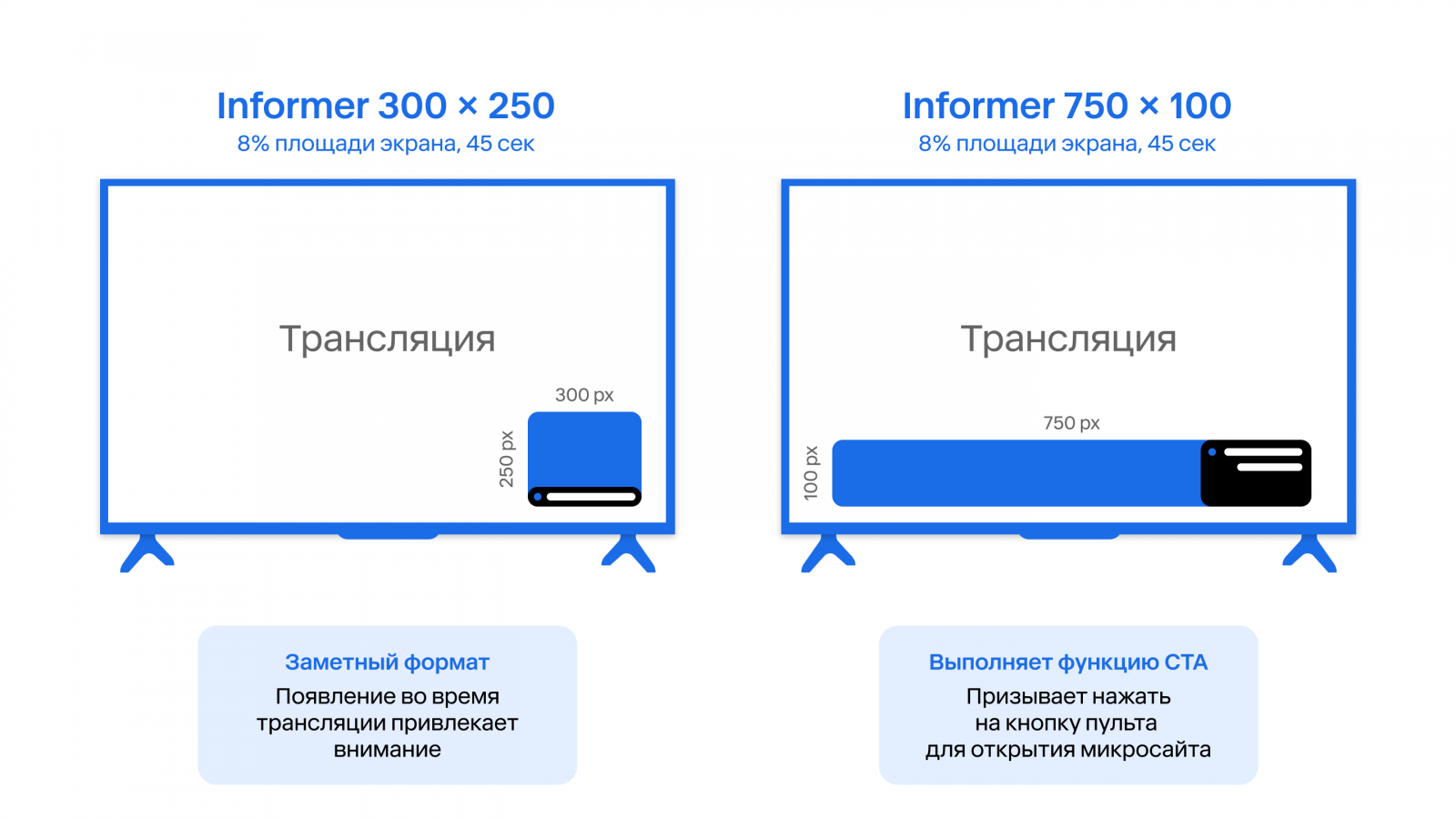 - доступным форматам — pre-roll, mid-roll, patch-roll, switch-roll с дополнительными интерактивными возможностями (pause banner, connected TV video и другими);