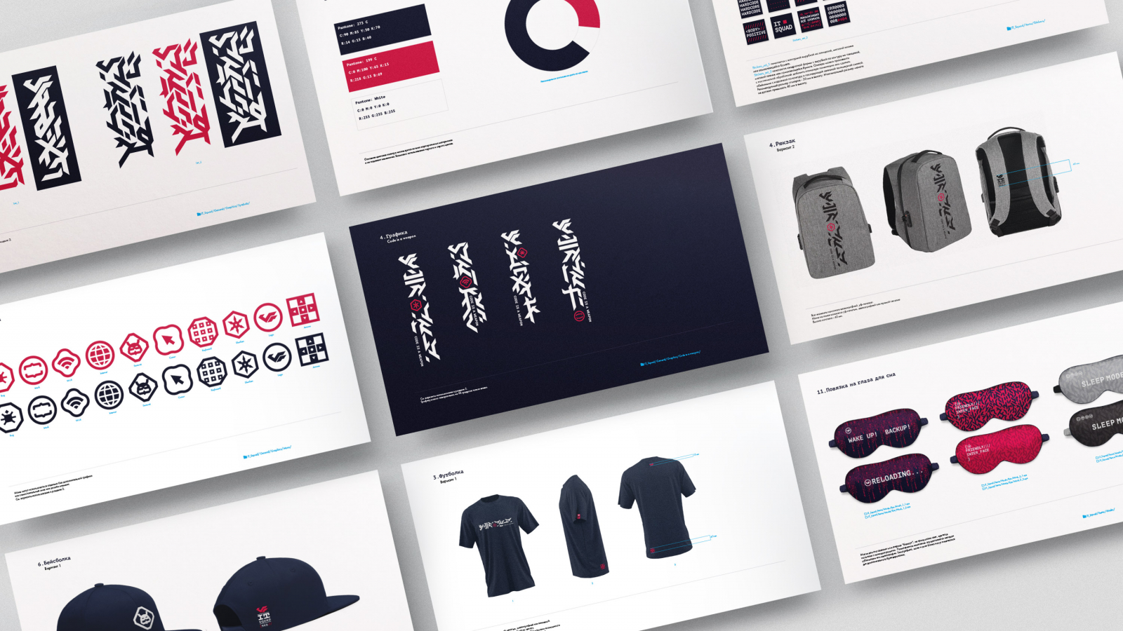 LINII разработало мерч в фирменном стиле для IT-подразделения банка. Логотип МКБ стал паттерном — он напоминает японские иероглифы, знаки клановой принадлежности — моны. Палитра состоит из красного с малиновыми оттенками темно-фиолетового, почти чернильного цветов. Последний напоминает темное небо, отсылает к эстетике индастриала и урбанистики.