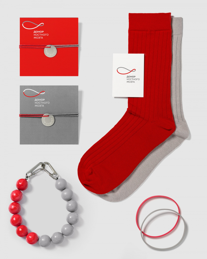 В основе проекта лежит пересечение двух путей: жизней донора и реципиента. Графически этот прием раскрывается через переплетение двух линий. Простая метафора работает на парных объектах: двухцветные носки, два браслета из красной и серой нитей, двуцветный обвес из переработанного пластика. Сами по себе предметы простые, но наполненные смыслом, который отражает суть проекта и откликается у аудитории.