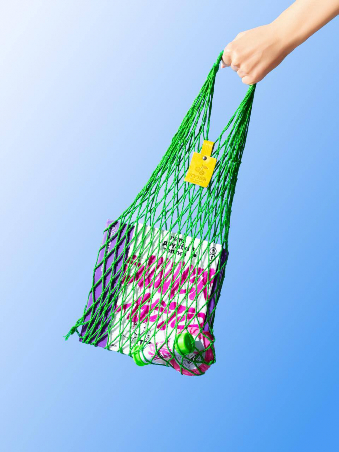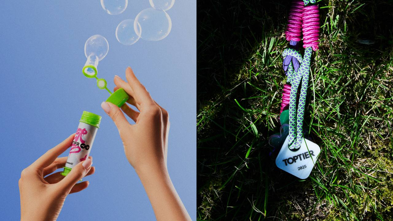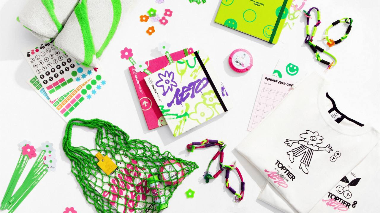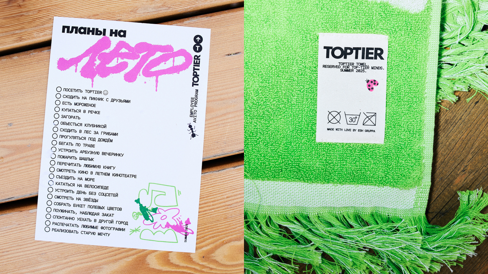 Еще один пример: «Авито» x ESH gruppa для летнего мероприятия Toptier 2025 — внутреннего ивента для успешных сотрудников «Авито». Простой набор всего необходимого для лета: мыльные пузыри, авоська, полотенце, футболка, цветочные браслетики, Hubba Bubba, летний чек-лист. Мерч объединен идеей и выделяется летним дизайном.