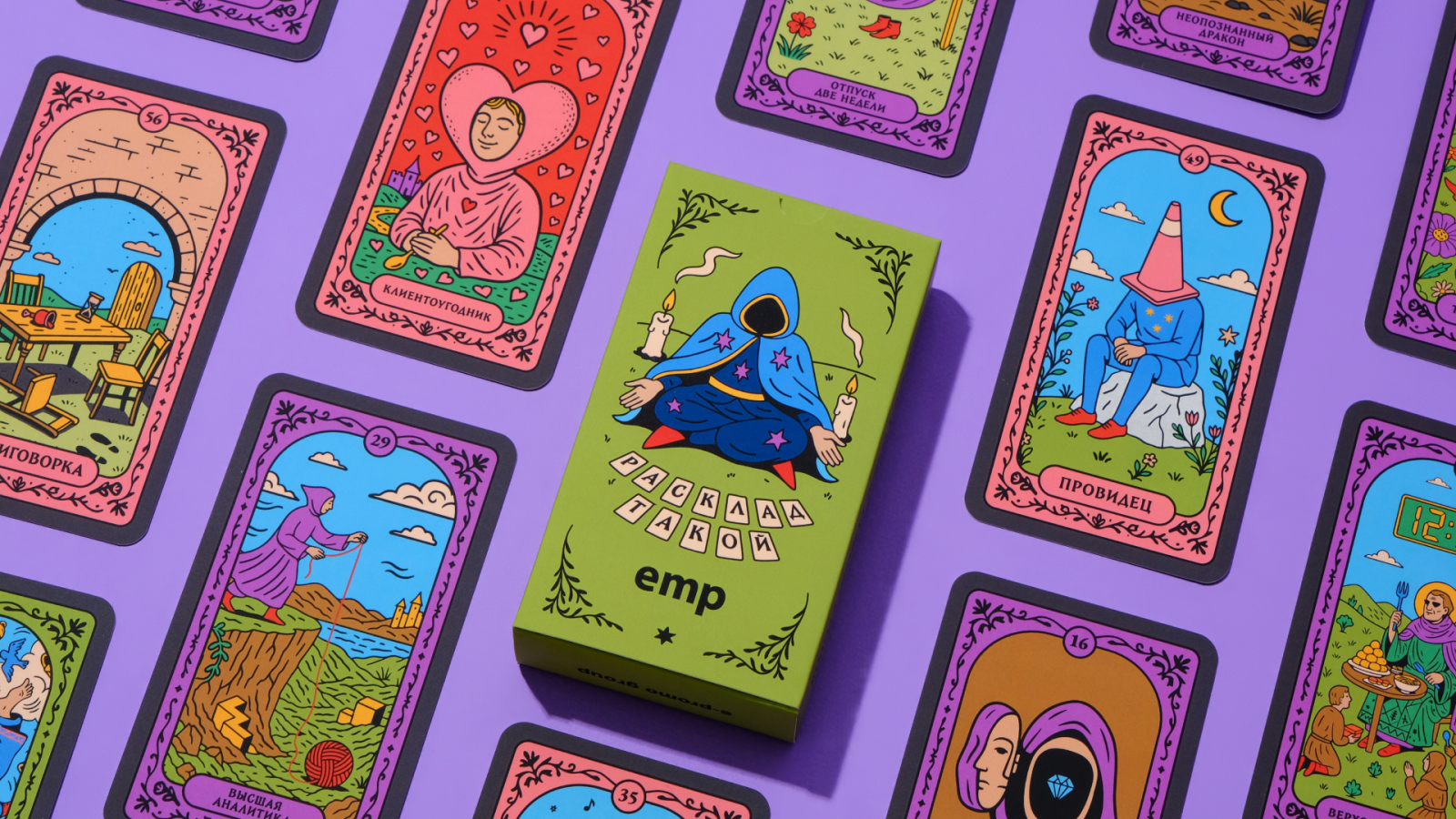 Например, мы помогли разработать компании EMP колоду метафорических карт, которая показывает офисную жизнь с любовью: без корпоративного новояза, зато с шутками про забытый обед, везунчика без единого зума за день и вечного «сейчас перезвоню».