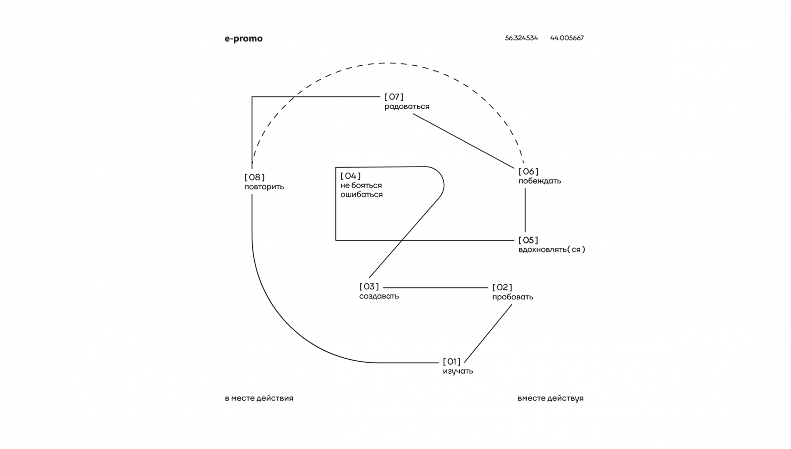 Пример — коллаборация E-Promo x «Родина» в проекте «В месте действия. Вместе действуя». Мы помогли им разработать подарок для партнеров: футболки и худи с картой партнерства. Ломаная линия маршрута отражает движение процесса: от идеи и первых попыток до воплощения и радости побед. А еще линия повторяет силуэт буквы «Е», заглавной буквы E-Promo.