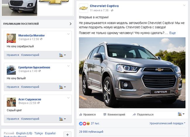 Любопытно, что подобные конкурсы в Facebook с розыгрышами авто не являются новшеством для стран бывшего СССР. Так, в Узбекистане был проведен псевдо-розыгрыш автомобиля Chevrolet Captiva. Буквально в этот же день устроители розыгрыша признались, что это была шутка с целью показать людям, что их очень легко обмануть. Автор поста также извинился и подчеркнул, что «никогда никто не подарит вам машину за лайк. Это никому не выгодно!». Шутку подхватили и другие пользователи, создав похожие посты с обещанием авто GM Uzbekistan.