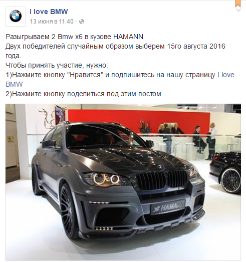 В начале июня в Facebook от лица сообщества I love Mercedes появился конкурс, получивший популярность благодаря необычайно щедрым призам: сообщество разыгрывало три автомобиля Mercedes-Benz E63 AMG ценой порядка 6 млн. руб за штуку. Условия участия были максимально простыми: достаточно было лайкнуть страницу, пост и сделать его перепубликацию с желаемым цветом авто - белым или черным.