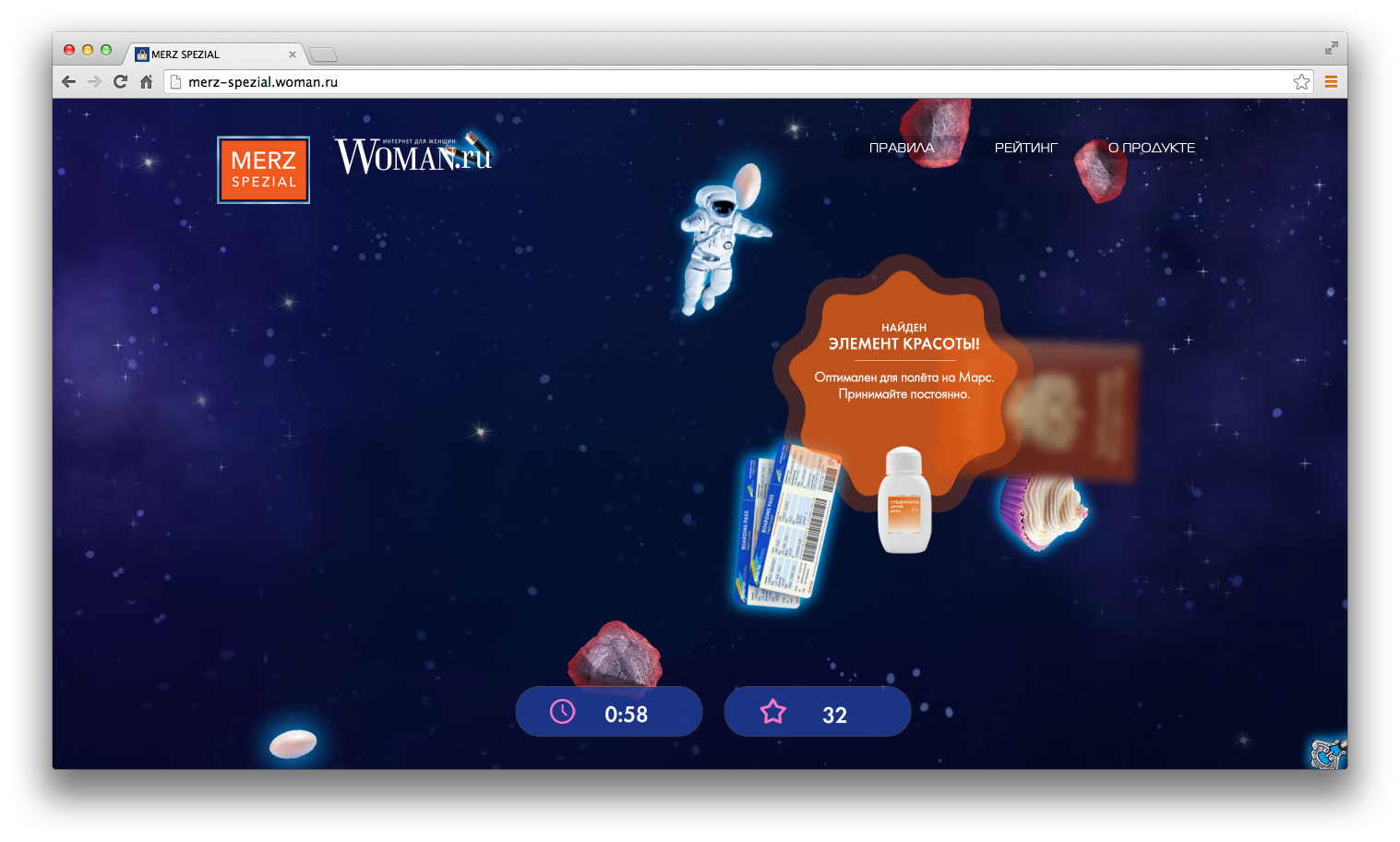 Агентство RTA разработало для бренда лечебной косметики Merz Spezial оригинальную digital-кампанию. В рамках кампании на специальной интернет-странице была создана интерактивная игра, главным героем которой является космонавт, блуждающий по космосу в поисках драже Merz. Космос в игре олицетворяет женскую сумочку, наполненную полезными и бесполезными предметами.