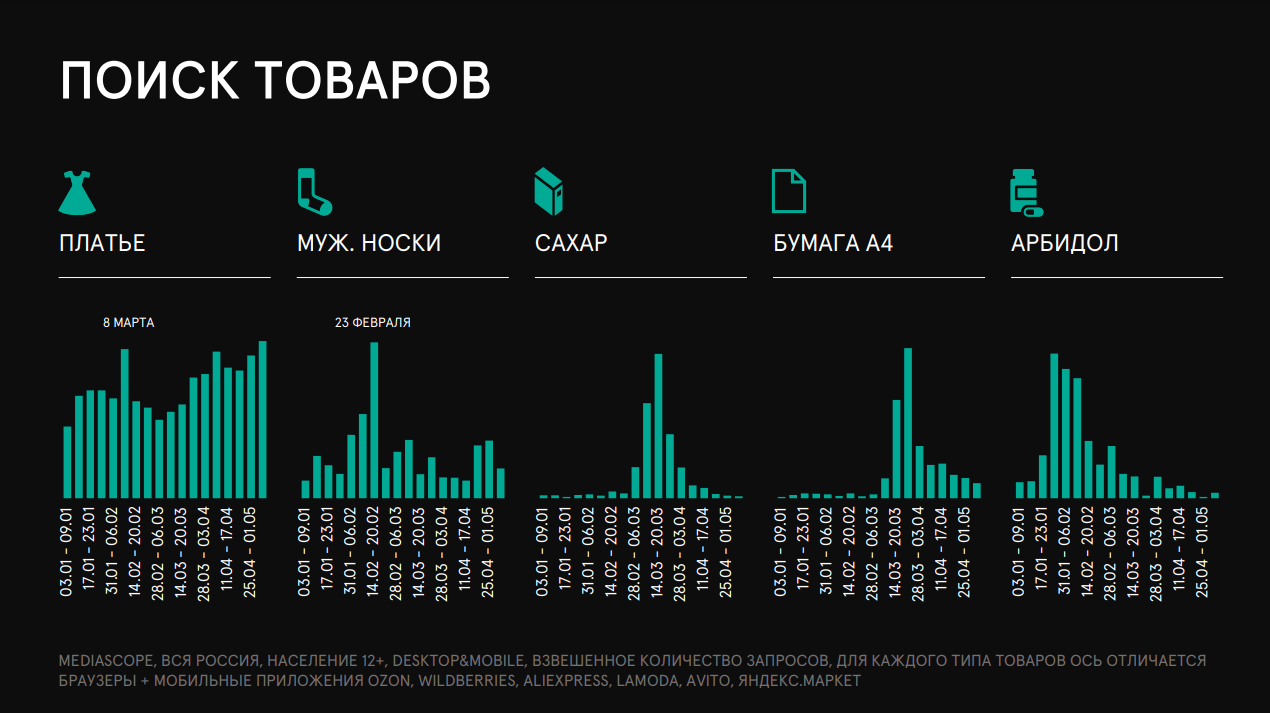 На динамику объёма e-comm активности могут заметно влиять отдельные события, такие как Всемирный день шоппинга и Черная пятница или некоторые праздничные периоды. В выходные дни времени на онлайн-шоппинг уходит больше, чем в будни. С началом спецоперации в Украине произошло некоторое снижение, но активность постепенно возвращается к прежним показателям.