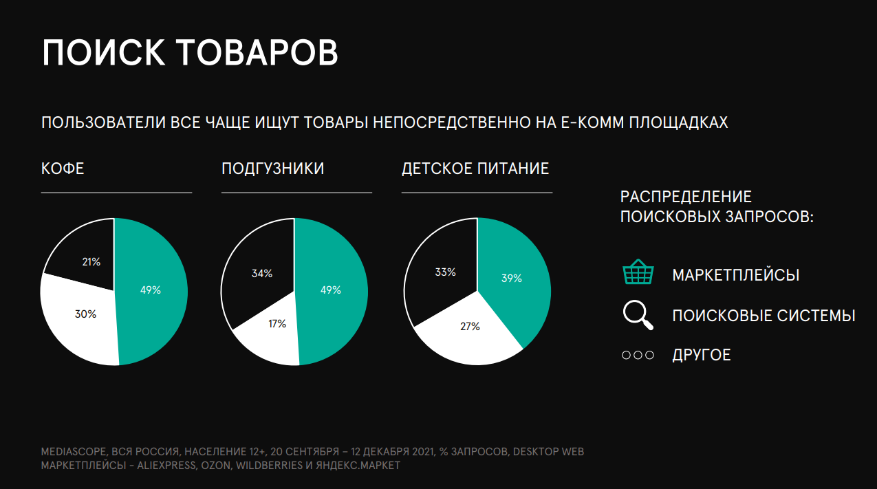 Россияне всё чаще ищут товары в интернете непосредственно на марктеплейсах. Так, например, в категориях «кофе», «подгузники», «детское питание» и в ряде других наибольшая доля поисковых запросов на десктопе уже сейчас приходится на марктеплейсы.