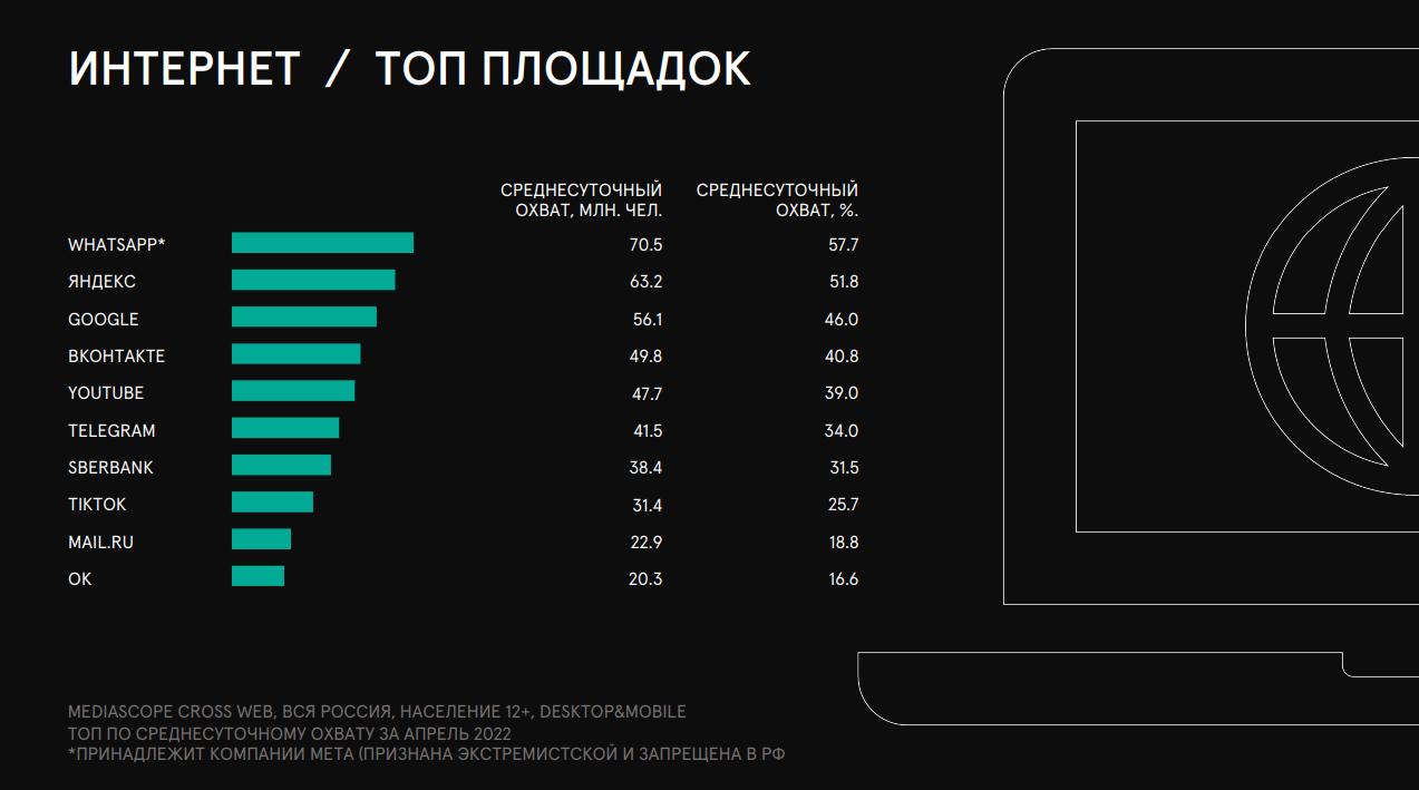 Также в Mediascope отметили, что в категории «видео» месячный охват самого крупного ресурса YouTube в марте и апреле 2022 значительно не изменился и остался на уровне 90 млн человек в возрасте от 12 лет. Каждый день видеохостинг в апреле и марте стали посещать чуть больше людей, чем в январе-феврале 2022: 48−49 млн против 45−46 млн человек.