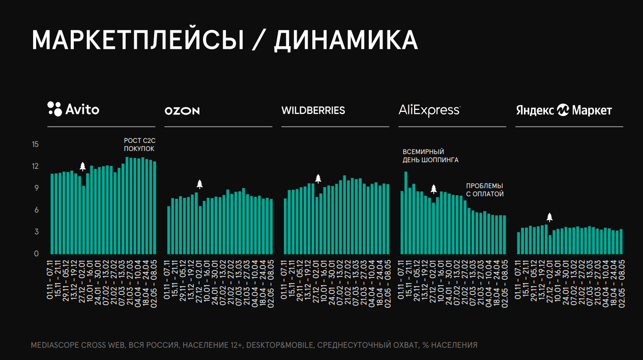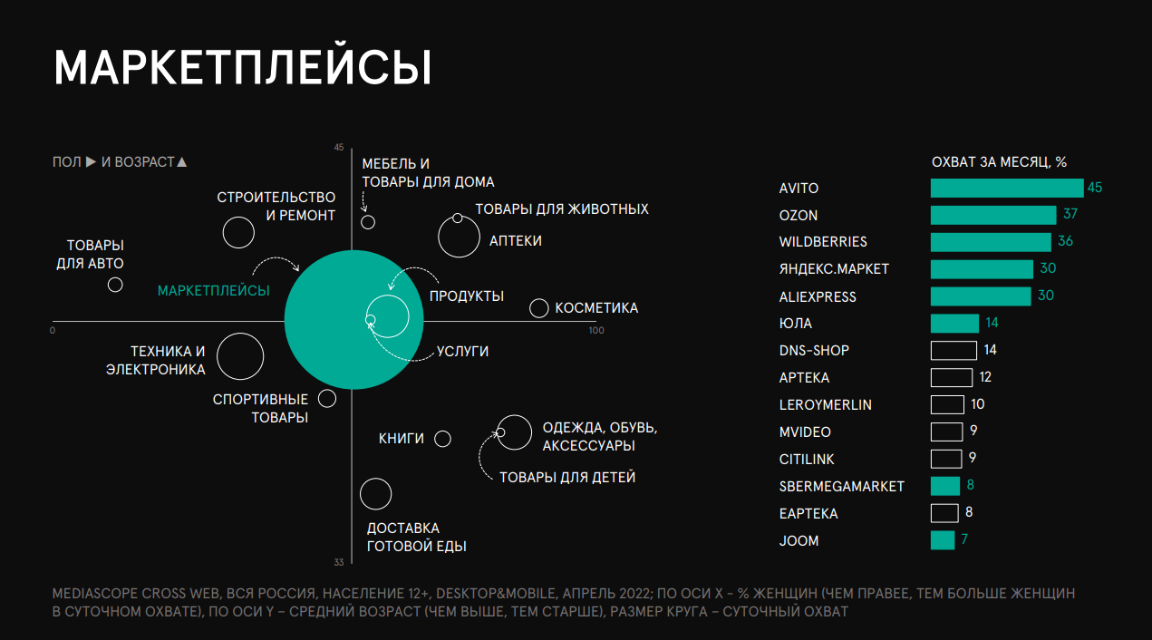 - Самым популярным маркетплейсом остается Avito — в апреле его охват достиг 45%, обогнав Ozon (37%) и Wildberries (36%).