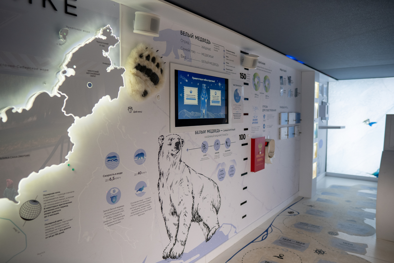 Следующий блок посвящён главному герою северного полюса — белому медведю. Здесь посетителям представилась возможность прикоснуться к Арктике — «дать пять» бутафорской, но реалистичной лапе белого медведя. А также узнать больше фактов о белом медведе, о том, почему он носит звание «хозяина Арктики» и что ему угрожает. Белый медведь является индикатором состояния арктической экологии, поэтому здесь также затрагиваются проблемы экосистемы региона. Блок повествует о влиянии внешнего мира на арктическую экосистему, он призван вдохновить посетителей на бережное отношение к природе и рациональное использование ресурсов.