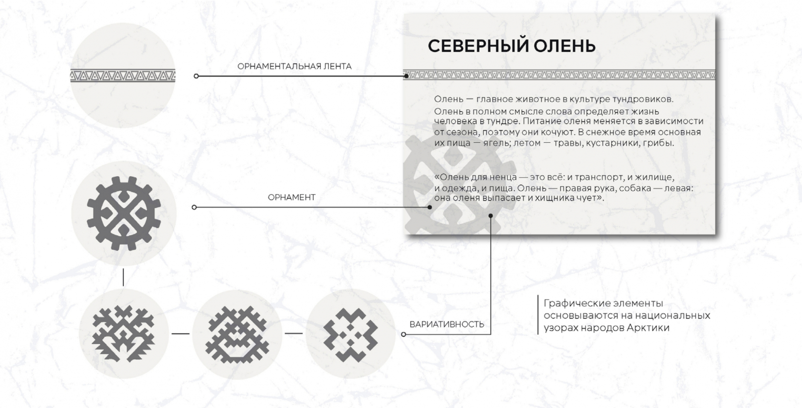 В качестве акцентных цветов были выбраны оттенки растительности: ягоды (клюква, черника, морошка) мох, ягель.