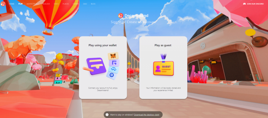 Чтобы посетить Decentraland, вам понадобятся: компьютер, интернет, браузер, криптовалютный кошелек. Зайдите на сайт Decentraland и нажмите «начать исследование» (start exploring) в правом верхнем углу. Также в метавселенную можно войти в качестве гость, тогда получится обойтись без криптовалютного кошелька. Но в этом случае изменения и настройки не сохранятся.