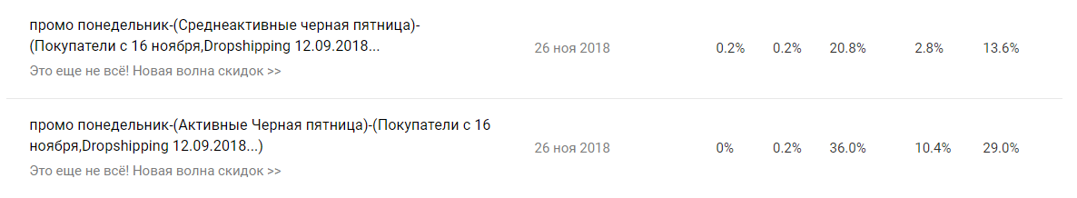 Активная группа раньше и чаще получала письма о скидках и распродажах. Письма для пассивных и малоактивных пользователей рассылались реже, но с более провокационными, «цепляющими» темами. Рассылка состояла из нескольких этапов с дополнительной сегментацией на каждом этапе.