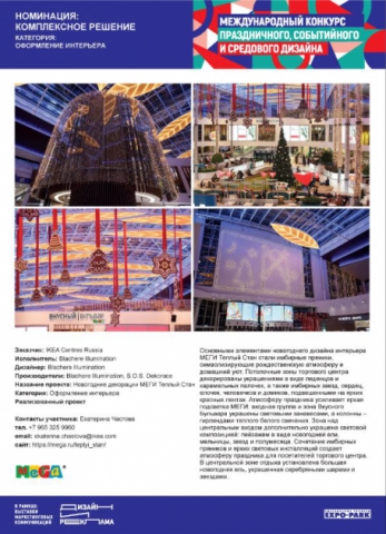 Если у вас есть успешные реализованные проекты по комплексному и локальному декорированию пространств, дизайну элементов оформления, то торопитесь до 20 марта подать заявку на Международный конкурс праздничного, событийного и средового дизайна, чтобы продемонстрировать свои работы компетентному жюри и широкой аудитории специалистов — посетителям выставки «ДИЗАЙН И РЕКЛАМА NEXT».