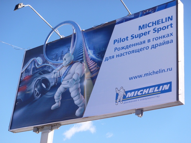 Реклама скоростных шин Michelin Pilot Super Sport размещается на поверхностях операторов наружной рекламы Gallery и Вера-ОЛИМП, преимущественно размеров 6х3, часть из них оборудована объемными экстендарами.