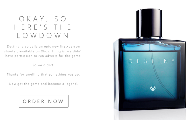 На сайте рядом с иллюстрациями фейкового парфюма Microsoft разместила следующий текст: «На самом деле Destiny - это эпический шутер от первого лица, доступный на Xbox. Дело в том, что нам запретили рекламировать игру, поэтому мы не делаем этого. Спасибо, что вы почуяли подвох. А теперь купите игру и станьте легендой!».