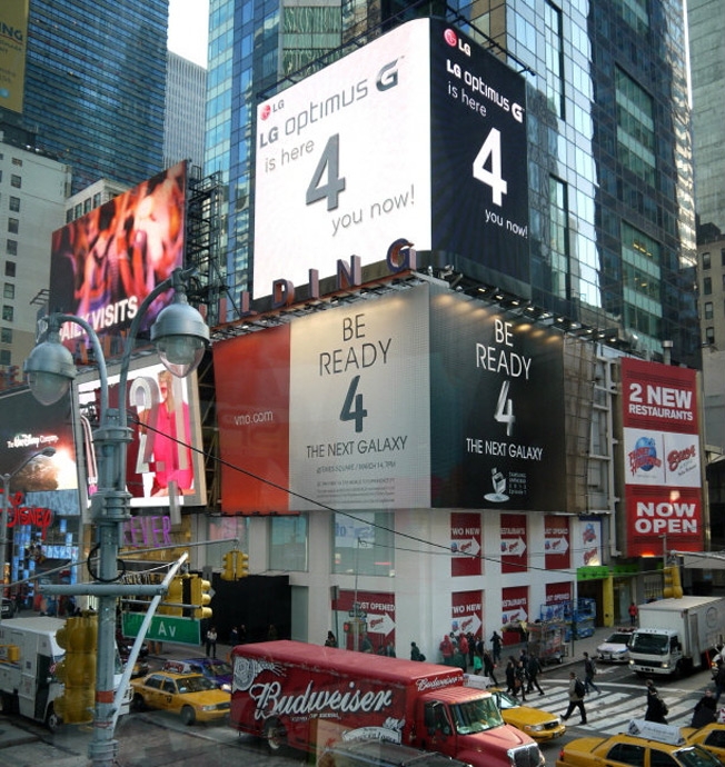 В этом году конкуренты высмеяли уже Samsung: компания LG разместила в Нью-Йорке огромный рекламный баннер, тонко высмеявший слоган Galaxy S4.