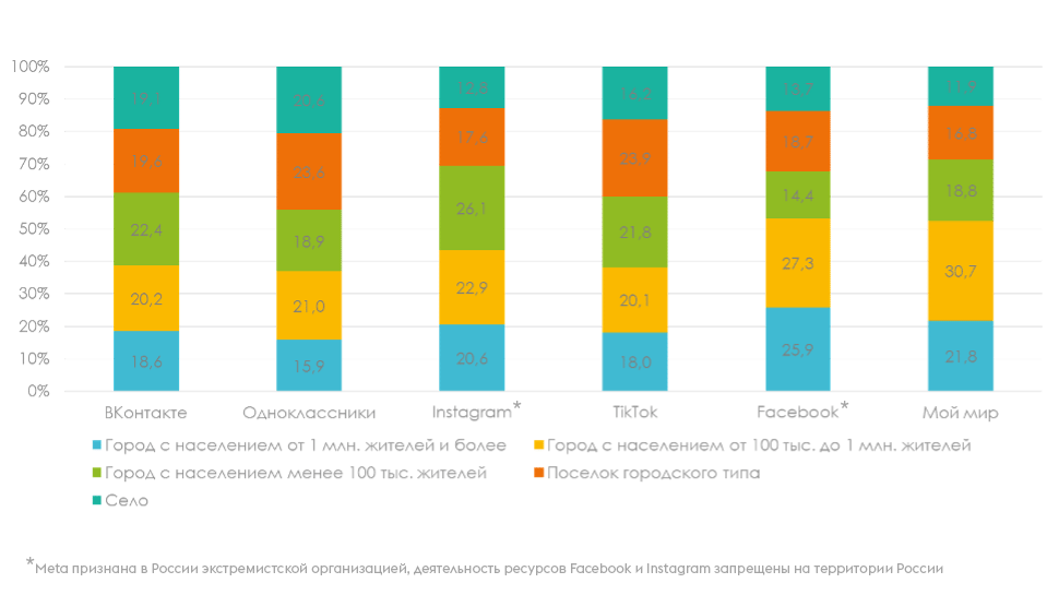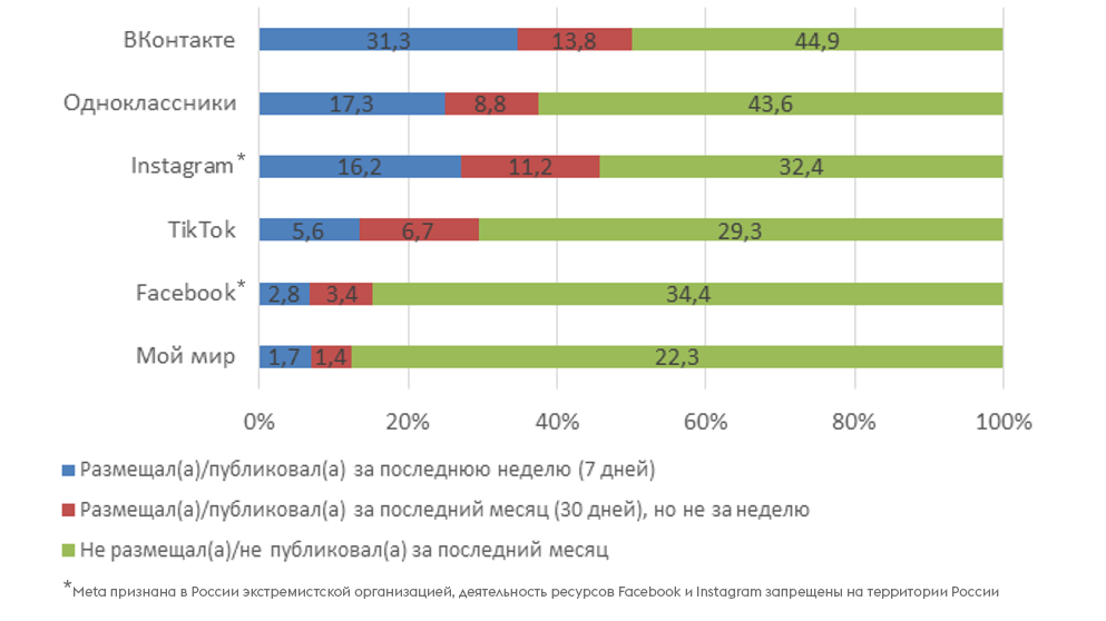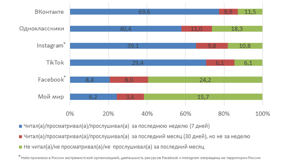 «ВКонтакте» также лидирует по уровню активности пользователей. Среди россиян, пользующихся соцсетями, 69,6% за последние семь дней хотя бы раз читали/просматривали/прослушивали сообщения на этой платформе, а 31,1% — размещали/публиковали контент. В первой шестёрке ведущих платформ доля неактивных пользователей выше всего у Facebook (запрещена в России, принадлежит Meta — признана экстремистской и запрещена в России) и социальной сети «Мой мир».