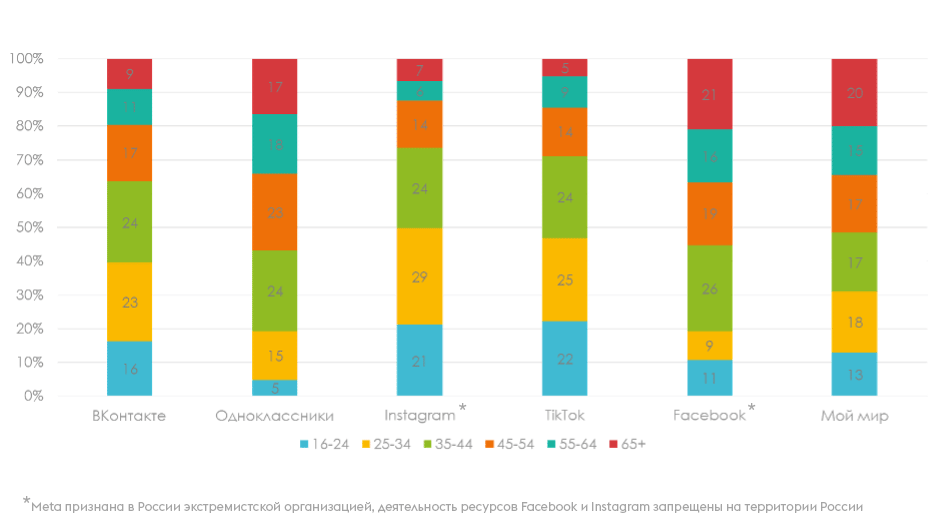 Аналитики РАЭК отмечают универсальность «ВКонтакте» как по возрастной аудитории, так и по географии — по этим категориям сеть достаточно сильно приближена к TikTok и Instagram, по географии приближена к Facebook.