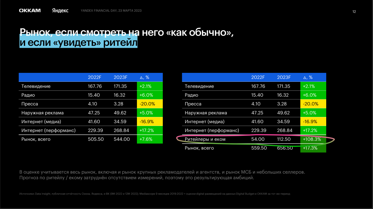 По оценке «Оккам», объём рекламного рынка без учёта ритейл-медиа в 2022 году составил 505,5 млрд руб., а с выручкой ритейлеров и e-com — 559,5 млрд руб. В 2023-м этот показатель может увеличиться до 522 млрд руб. и 656,5 млрд руб. соответственно. При этом наибольший рост, если не брать в расчёт ритейл-медиа, продемонстрирует диджитал-перформанс (17,2%), тогда как медийная диджитал-реклама упадёт на 16,9%. Телевидение останется в небольшом плюсе, но лишь на 2,1%. Чуть больший рост в «Оккам» прочат наружной рекламе (5%) и радио (6%). Пресса продолжит падение, как и в предыдущие годы.