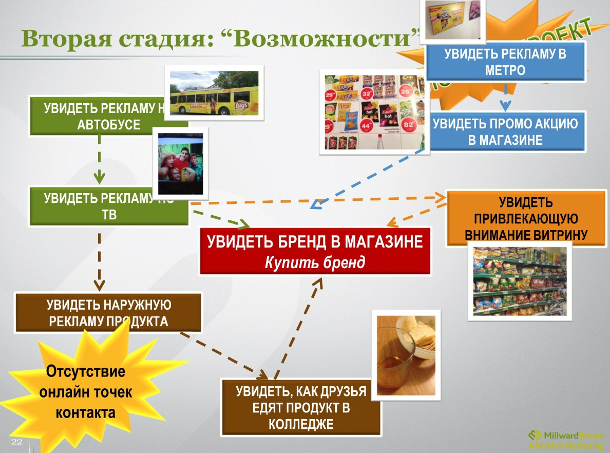Как отметили на презентации представители Millward Brown, пилотное исследование показало, что онлайн-точки контакта потребителя с брендами (соцсети, поиск и т.д.) на стадии «Моменты» упоминались лишь несколькими респондентами, а на этапе «Возможности» и вовсе отсутствовали. Поэтому в рамках исседования стоит задача ответить на вопрос, как различные каналы коммуникации взаимодействуют и дополняют друг друга.