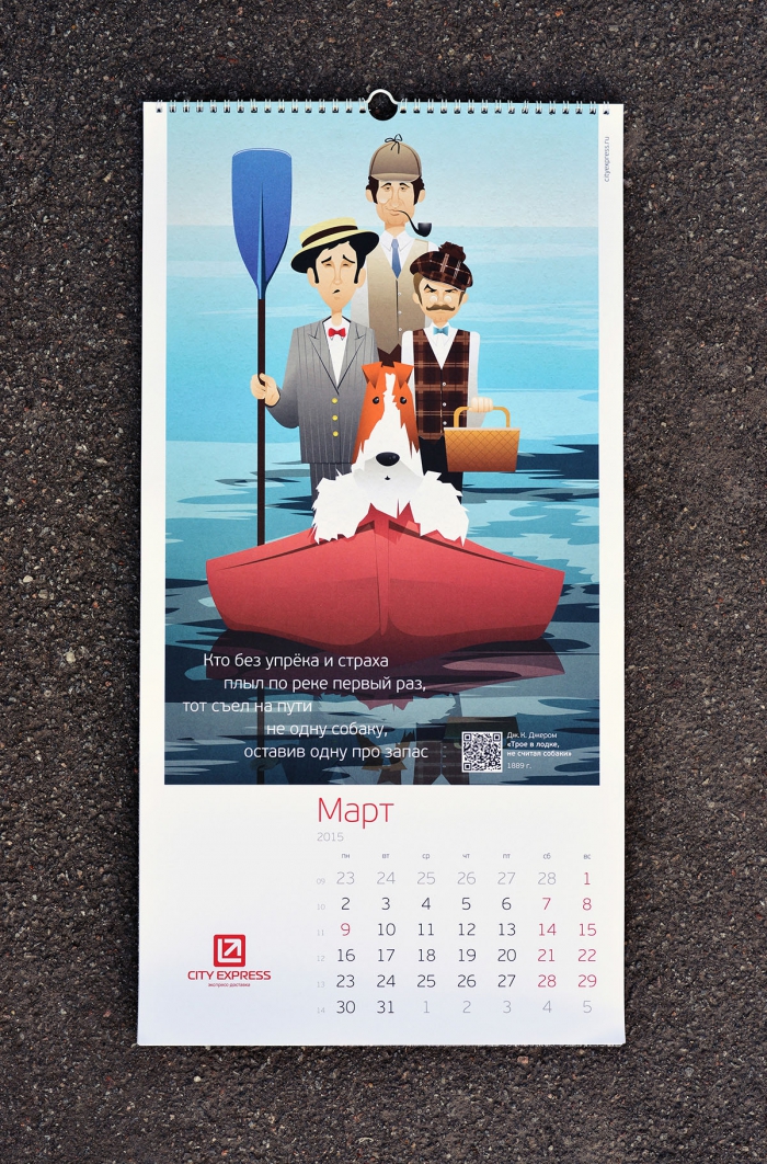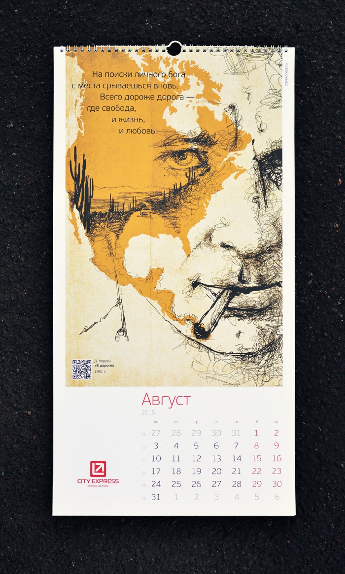 Студия графического дизайна Deza придумала и оформила календарь для компании City Express, занимающейся экспресс-доставкой документов, посылок и грузов. Основной темой календаря стали дороги и пути, рассказать о которых помогли романы и новеллы о путешественниках.