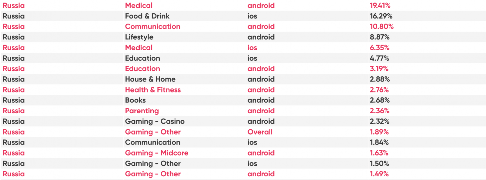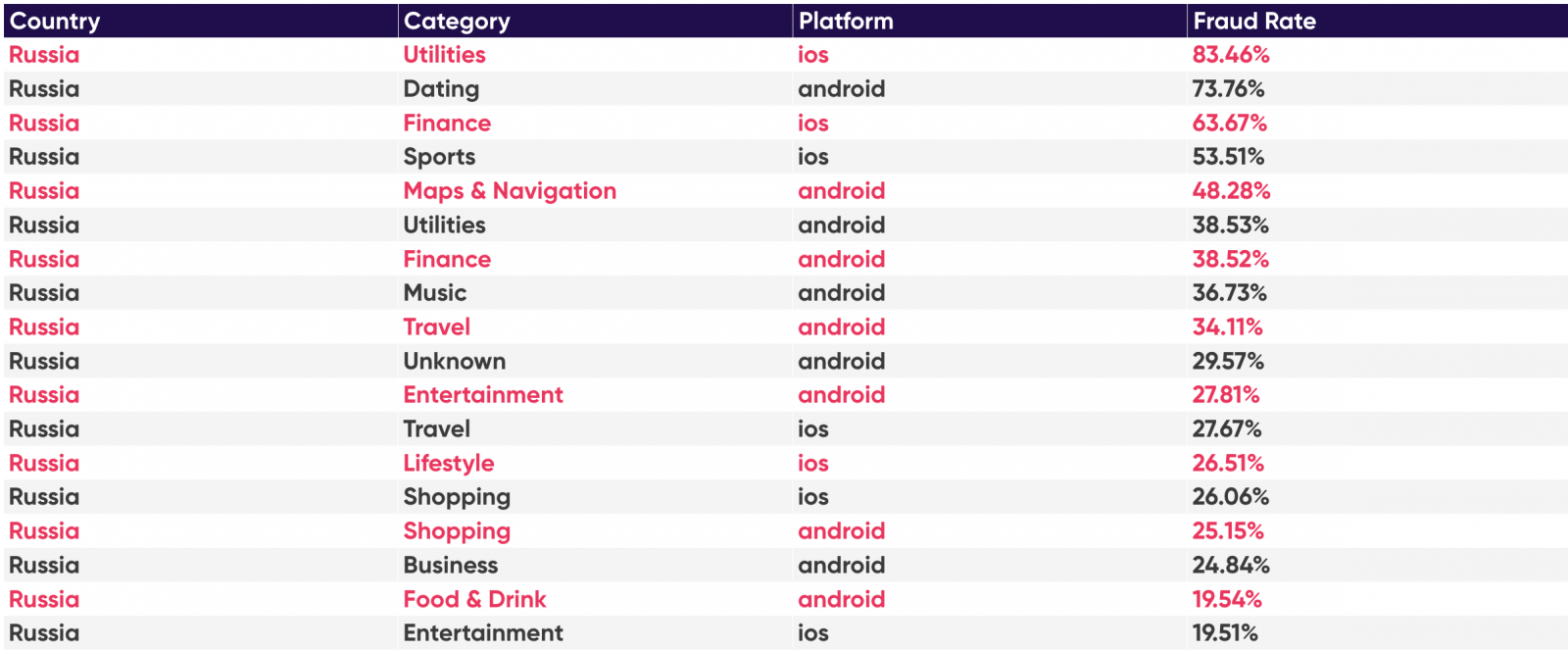 Цифры в отчёте у Appsflyer по факту колоссальные, но если говорить про вертикали, где фрод превалирует, то можно убедиться, что крайне высокие показатели наблюдаются практически во всех срезах: дейтинга, финансов, e-commerce, утилит, навигации и так далее.