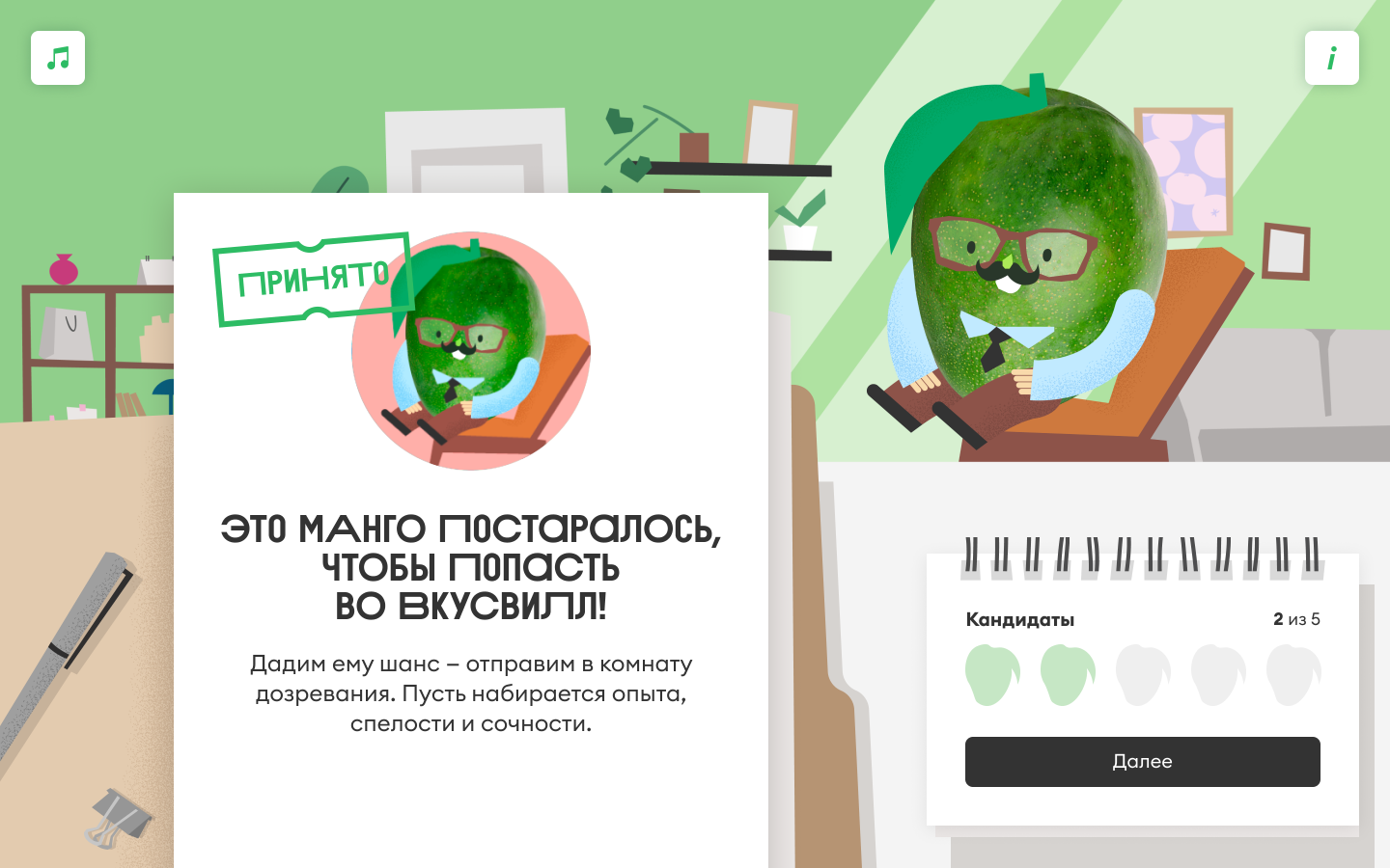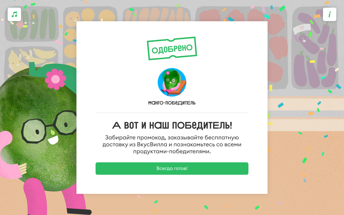 Еще одним способом просто рассказать о сложной системе проверки качества стала разработка игры «Проведи собеседование продуктам». Через геймификацию «ВкусВилл» упрощенно показывает отбор и испытания, которые проходит продукт, прежде чем попасть на полку сети. Пользователь примерит на себя роль строгого сотрудника управления по проверке качества и выберет самое спелое манго, самое свежее молоко и самый натуральный ролл с форелью.