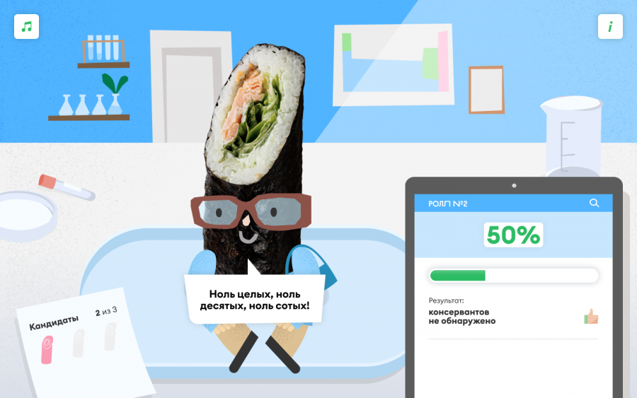 Игрок с помощью лупы должен осмотреть трех оставшихся кандидатов и проверить их на качество по утвержденному списку критериев. Если пользователь обнаружит вещества, ухудшающие его качество и безопасность продуктов — кандидат выбывает из гонки на полку.