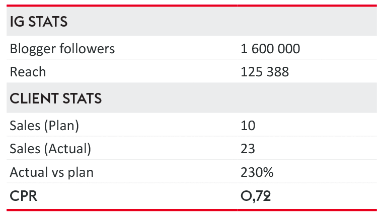 В результате тестовая кампания прошла успешно. Продажи с использованием промокода более чем в два раза превысили плановые показатели, Reach составил более 120 тыс. уникальных пользователей, при этом стоимость охвата аудитории оказалась ниже рыночных бенчмарков.