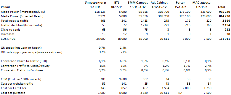 Самый дешевый способ охвата (по СPM) через платное промо в соцсетях дал крайне низкую конверсию в целевые действия: активность на сайте, продажи (0,1% конверсия от номинального охвата в реальный трафик на сайт). Напротив, использование самого эффективного по конверсии канала — BTL — приводит к существенным затратам.