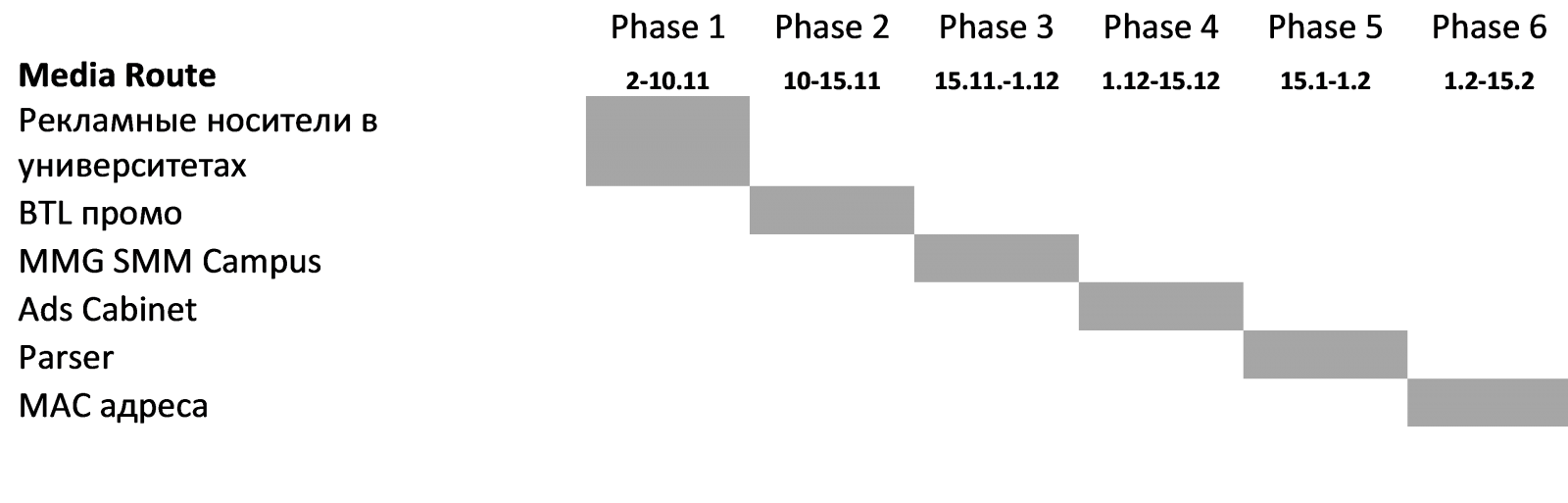 Для получения чистых данных по эффективности каждого канала и инструментария мы составили медиаплан, в рамках которого все медиаканалы включались в кампанию последовательно. Каждый раз мы охватывали студентов новых вузов, не задействованных в предыдущей фазе кампании.