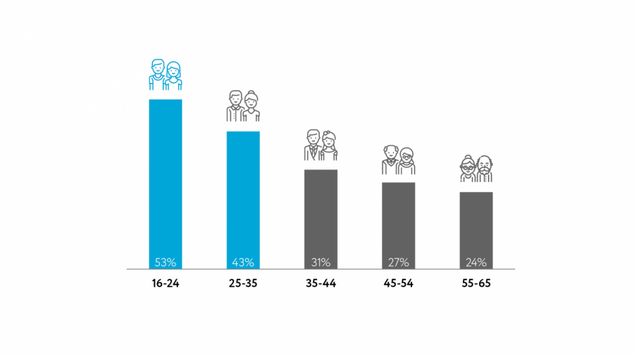 3. Молодежь потребляет информацию в интернете в формате fast scrolling, устанавливает блокировщики рекламы, поэтому практически не видит рекламные сообщения. Только 9% аудитории 18−23 досматривают OLV до конца.
