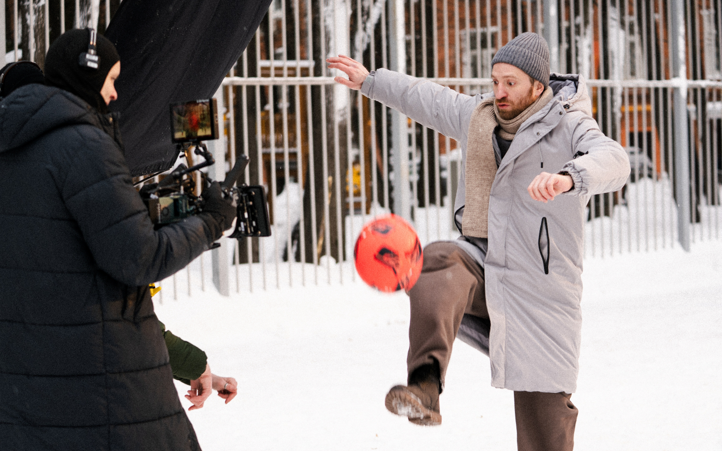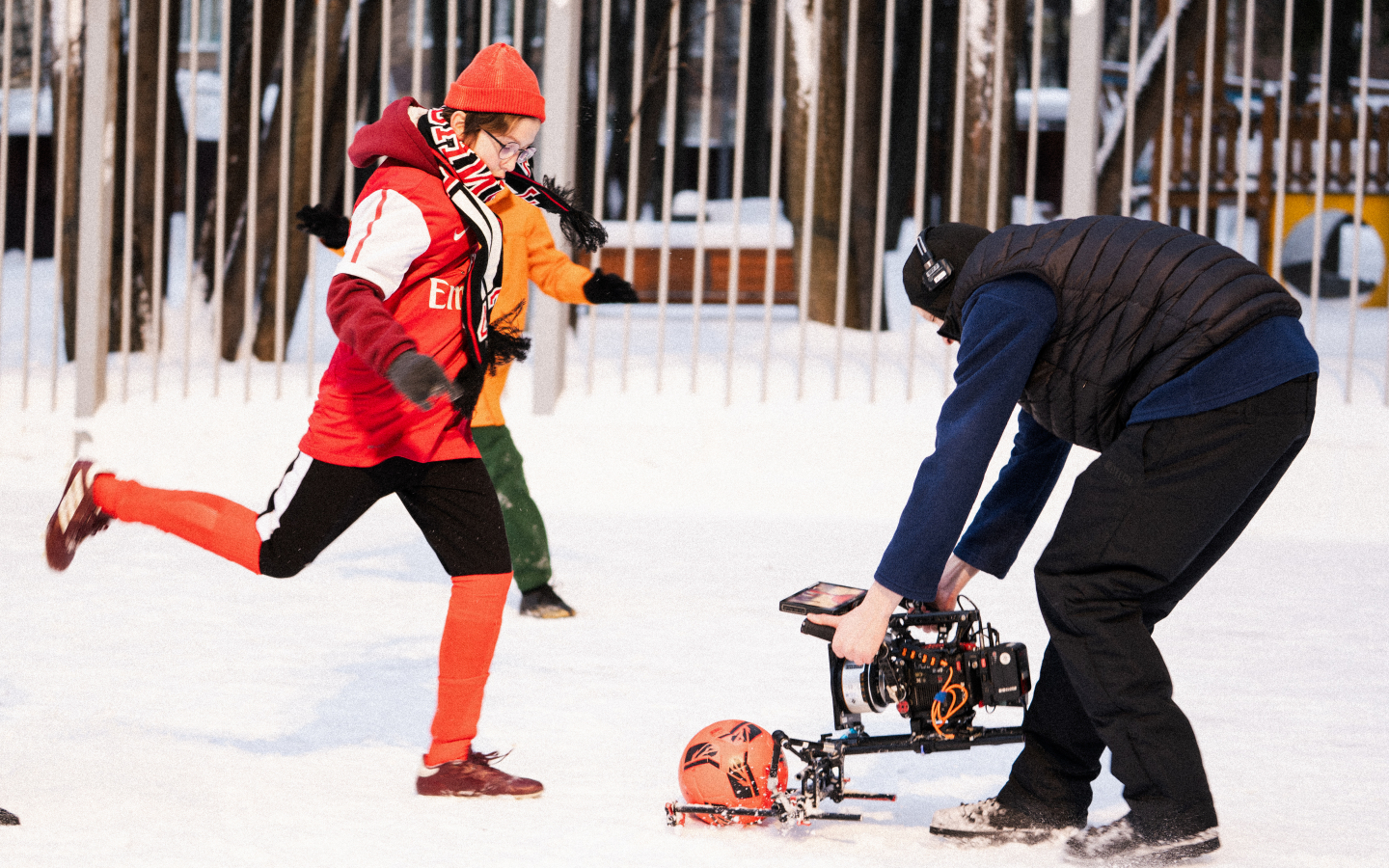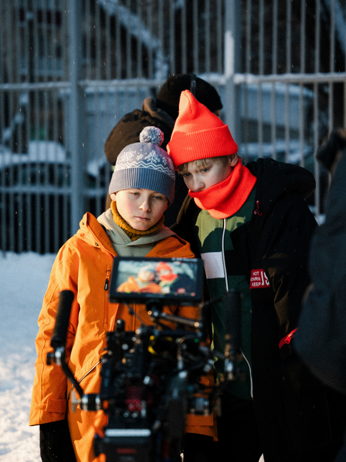 На площадке у команды было несколько челленджей: снять кадры с закрепленной на голове ребенка камерой, аккуратно выдернуть леской телефон из кармана актера, уложиться в один съемочный день. Последнее — задачка со звездочкой, учитывая количество светлых часов в Москве в пасмурный день. Продлить рабочее время помогло искусственное освещение, имитирующее солнце.