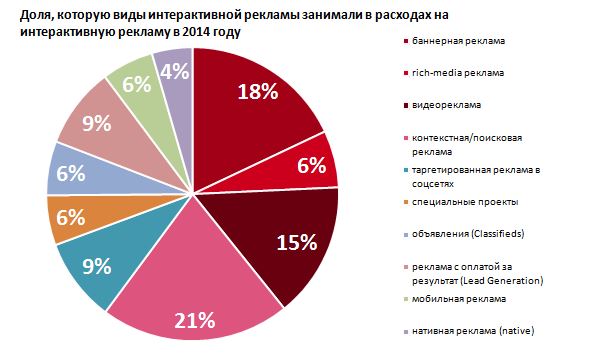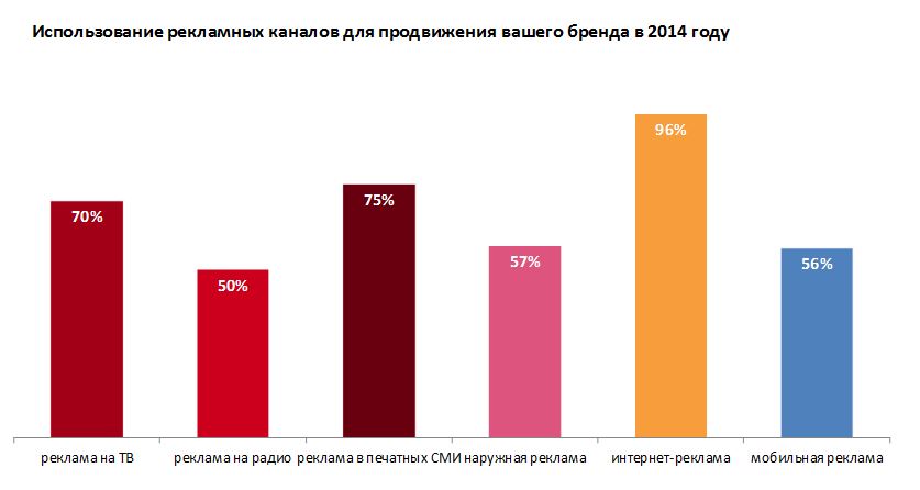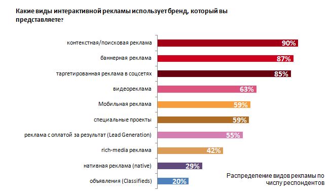 Среди интерактивных форматов мобильная реклама занимает пятое место по популярности. Для продвижения в интернете ее выбирают 59% опрошенных. Опережают mobile контекст (90%), баннеры (87%), таргетированные объявления в соцсетях (85%) и видеореклама (63%). Отметим, что в 2013 году мобильную рекламу использовали 46% респондентов.
