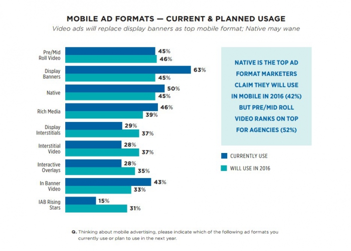 Начало 2016 года ознаменовалось стремлением игроков рынка, наряду с использованием привычным форматов (баннеры, нативная реклама, пре-роллы, rich media), вкладываться в новые форматы мобильной рекламы, говорится в опросе компании Trusted Media Brands. Исследование основано на мнении 283 руководителей - как с клиентской, так и агентской стороны, и проводилось в январе 2016 года на крупнейшем рынке медийных коммуникаций - рынке США.