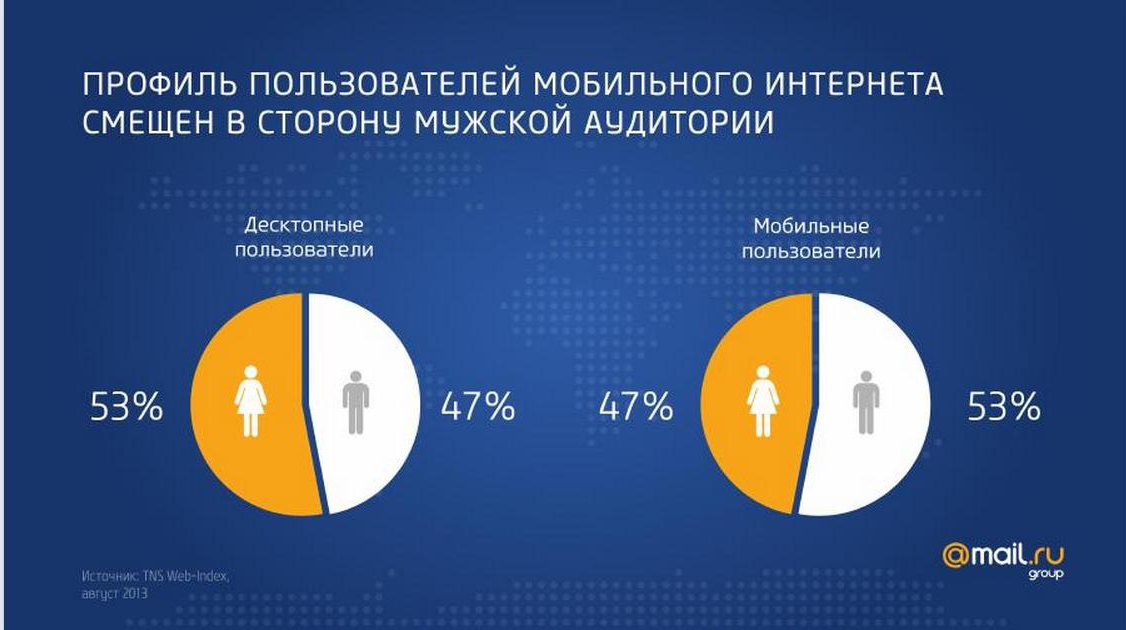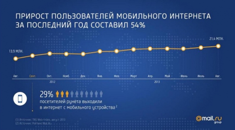 Аудитория мобильного интернета в России, по последним данным TNS и Mail.ru Group, составляет 21,4 млн. пользователей. За последний год (август 2012 к августу 2013) она выросла на 54%.