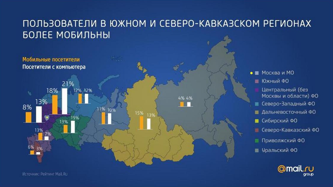 Пользователи в Южном регионе и на Северном Кавказе более мобильны: там в два раза больше заходят в интернет с телефона, чем с компьютера – в Москве по-прежнему лидирует desktop. Кроме того, 49% пользователей проводят в вебе до 20 минут. Мобильная аудитория наиболее активна вечером с 22 до 24 и в выходные, когда мобильный браузер по числу входов опережает обычный браузер.
