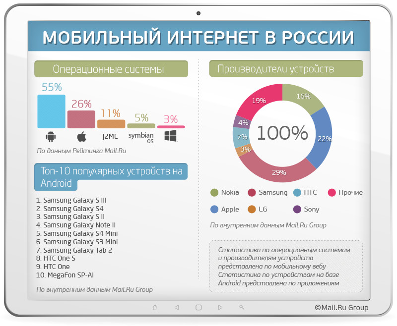 Исследование российского рынка мобильного интернета основано на данных «Рейтинга Mail.Ru», а также на анкетах пользователей «Почты Mail.Ru» и социальной сети «Одноклассники».